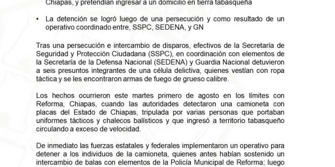 Los hechos ocurrieron este martes primero de agosto en los límites con Reforma, Chiapas, cuando las autoridades detectaron una camioneta con placas del Estado de Chiapas, tripulada por varias personas que portaban uniformes tácticos y chalecos balísticos y que ingresó a territorio tabasqueño circulando a exceso de velocidad.
