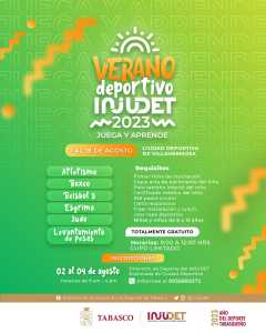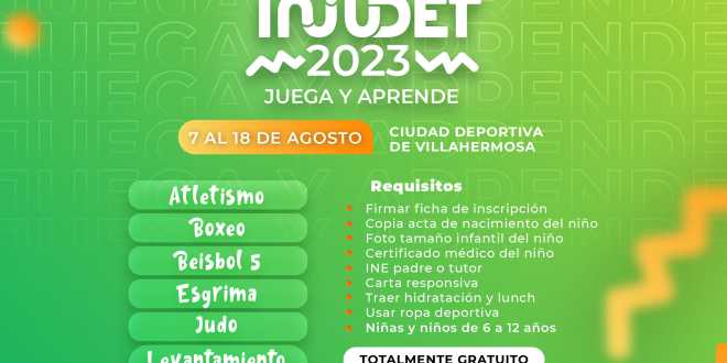 Con el objetivo promover la sana convivencia y aprovechamiento del tiempo libre en las vacaciones de verano de la niñez tabasqueña, el Instituto de la Juventud y el Deporte de Tabasco invita a padres y madres de familia a inscribir a sus hijos en “Juega y Aprende” Verano Deportivo INJUDET 2023.