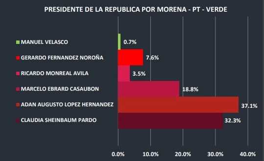 La casa encuestadora GANA. Análisis de datos y Encuestas de opinión pública, registró que el 37.1 % de los simpatizantes de Morena, prefiere a Adán Augusto López Hernández entre todos los participantes del proceso interno. Los morenistas lo posicionan con una ventaja de 4.8 puntos porcentuales sobre Claudia Sheinbaum, quien aparece segunda con 32.3%, seguida de Marcelo Ebrard con 18.8%, Gerardo Fernández Noroña con 7.6%, Ricardo Monreal con 3.5%, Manuel Velasco 0.7% de las preferencias.
