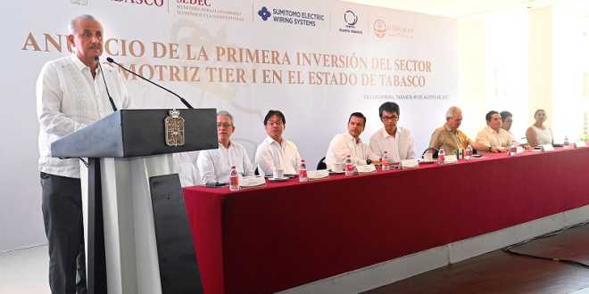 Con una inversión de 10 millones de dólares, el grupo de origen japonés Sumitomo Electric Wiring Systems instalará planta manufacturera de arneses eléctricos para vehículos en el Parque Industrial TBC situado en Cunduacán, anuncia el gobernador.