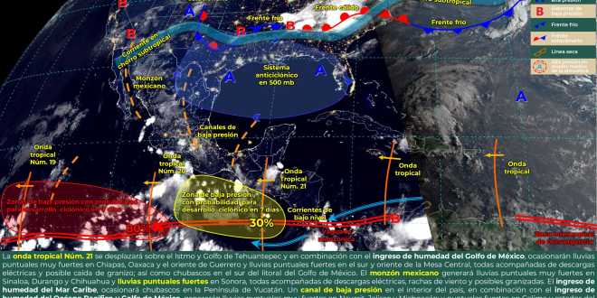 Estas precipitaciones serán causadas por la onda tropical número 21 que se desplazará sobre el Istmo y Golfo de Tehuantepec, el ingreso de humedad del Golfo de México, así como la presencia del monzón mexicano y un canal de baja presión en interior del territorio nacional. Se espera que las lluvias de fuertes a muy fuertes originen encharcamientos, incremento en los niveles de ríos y arroyos, así como deslaves e inundaciones en zonas bajas, por lo que se recomienda a la población de los estados afectados atender las indicaciones de Protección Civil.