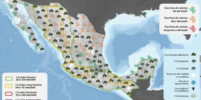 Este sábado, el monzón mexicano, en el noroeste de México, y canales de baja presión en el interior del país, en combinación con inestabilidad en niveles altos de la atmósfera y el ingreso de humedad del Océano Pacífico y el Golfo de México, así como el avance de la onda tropical número 22 sobre la Península de Yucatán, originarán lluvias muy fuertes (de 50 a 75 milímetros [mm]) en Chihuahua, Colima, Durango, Jalisco, Nayarit, Sinaloa y Sonora; fuertes (de 25 a 50 mm) en Chiapas, Estado de México, Guerrero, Michoacán y Oaxaca.