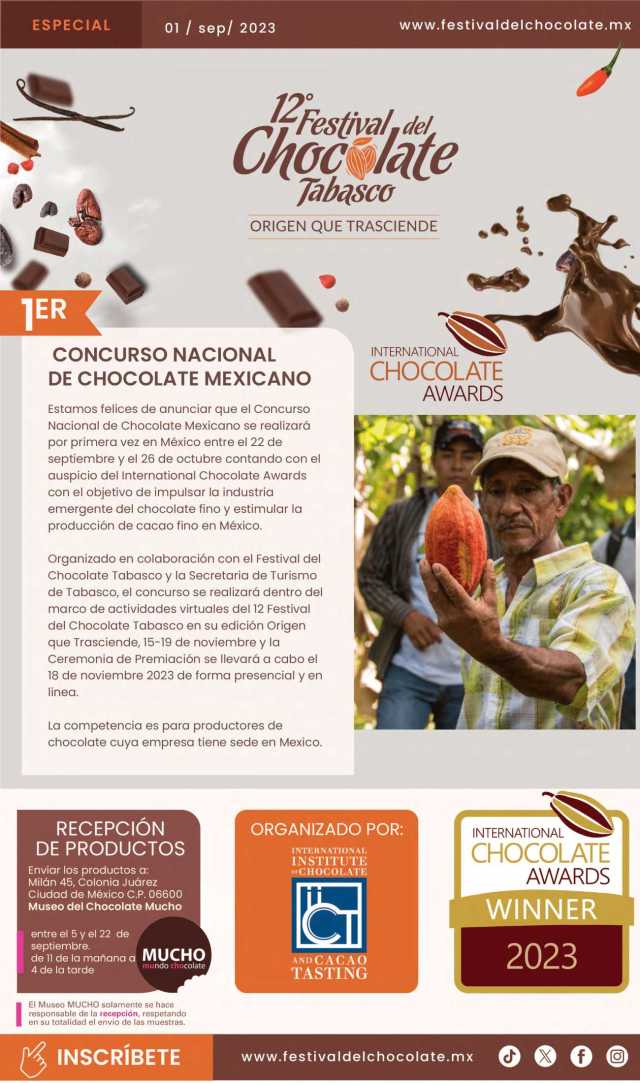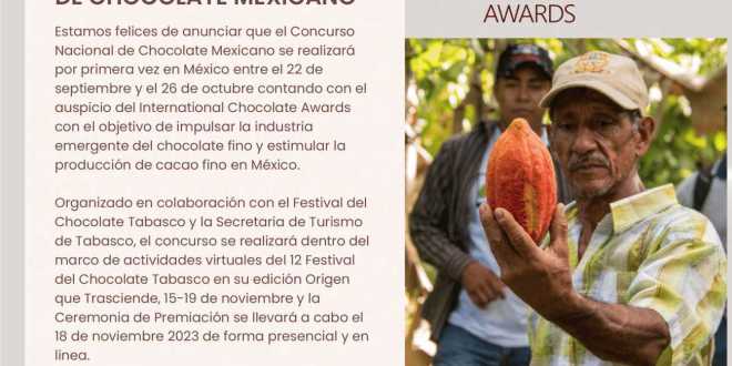 El Gobierno del Estado a través de la Secretaría de Turismo de Tabasco, invita a los productores de chocolate tabaqueño a participar en el Primer Concurso Nacional de Chocolate Mexicano» que se realizará por primera vez en México entre el 22 de septiembre y el 26 de octubre, contando con la colaboración del International Chocolate Awards a fin de impulsar la industria emergente del chocolate fino y estimular la producción de cacao fino en México.
