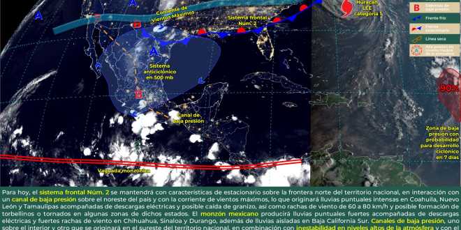 Para este viernes se prevén lluvias puntuales intensas (de 75 a 150 milímetros [mm]) en Coahuila, Guerrero, Nuevo León, Oaxaca y Tamaulipas; muy fuertes (de 50 a 75 mm) en sitios de Chiapas, Michoacán y Morelos; fuertes (de 25 a 50 mm) en Chihuahua, Colima, Durango, Estado de México, Jalisco, Nayarit, San Luis Potosí, Sinaloa, Puebla y Veracruz; intervalos de chubascos (de 5 a 25 mm) en regiones de Campeche, Ciudad de México, Hidalgo, Quintana Roo, Tabasco, Tlaxcala, Yucatán y Zacatecas, así como lluvias aisladas (de 0.1 a 5 mm) en Baja California Sur, Guanajuato y Querétaro.