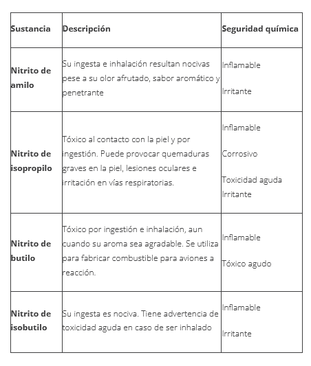 A continuación, se comparten las características y seguridad química de los nitritos contenidos en los “poppers”: