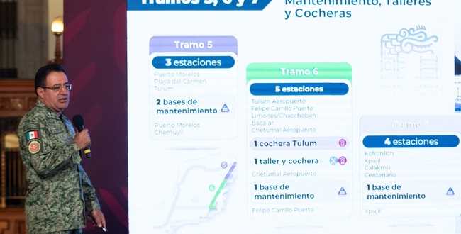 En el tramo 6, añadió, se edifican cinco estaciones, una cochera en Tulum para mantenimiento y resguardo de los trenes; un taller y cochera en Chetumal, y una base de mantenimiento para la vía en Felipe Carrillo Puerto, mientras que en el tramo 7 se tienen cuatro estaciones y una base de mantenimiento en Xpujil.