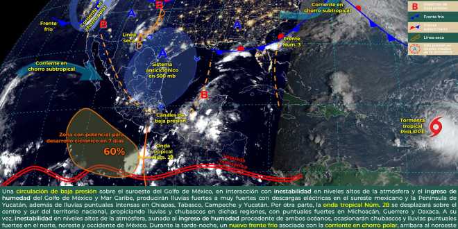 Para este sábado se pronostican lluvias puntuales intensas (de 75 a 150 milímetros [mm]) en regiones de Campeche, Chiapas, Tabasco y Yucatán; muy fuertes (de 50 a 75 mm) en zonas de Quintana Roo y Veracruz; fuertes (de 25 a 50 mm) en áreas de Colima, Guerrero, Jalisco, Michoacán, Nayarit y Oaxaca; intervalos de chubascos (de 5 a 25 mm) en Chihuahua, Ciudad de México, Coahuila, Durango, Estado de México, Morelos, Nuevo León, Puebla, San Luis Potosí, Sinaloa y Tamaulipas, así como lluvias aisladas (de 0.1 a 5 mm) en Baja California, Hidalgo, Querétaro, Sonora, Tlaxcala y Zacatecas.