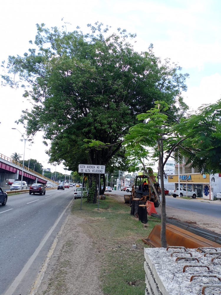 Ante los trabajos de construcción de la quinta etapa del Distribuidor Universidad, más de 10 árboles adultos incluyendo una ceiba, serán derribados. Dependerá de la Semarnat determinar si las empresas deberán reforestar en alguna otra área de la ciudad para reponerlos. En el lugar se observa que han sido derribados al menos cuatro cedros pero de acuerdo con personal de la obra se retirarán al menos otros diez.