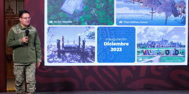 El general Lozano Águila resaltó que los proyectos de infraestructura beneficiarán a 718 mil habitantes en la región. Las estaciones Chichén Itzá, Valladolid, Nuevo Xcán, Leona Vicario y Cancún Aeropuerto superan el 80 por ciento de edificación.
