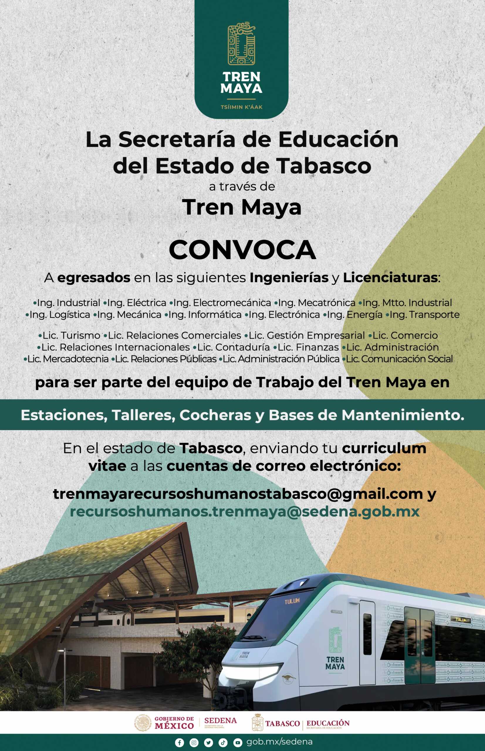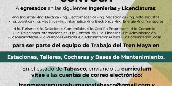 Para laborar en el Tren Maya –una de las obras prioritarias del presidente Andrés Manuel López Obrador–, la Secretaría de Educación (Setab) invita a egresados de distintas licenciaturas e ingenierías del estado de Tabasco, a formar parte de la magna obra y colaborar en estaciones, talleres, cocheras y bases de mantenimiento.