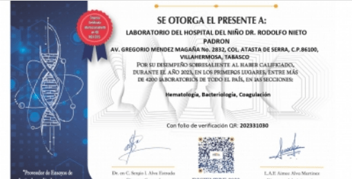 Así mismo se obtuvo un Diploma especial, por el desempeño sobresaliente del Laboratorio del Hospital Regional de Alta Especialidad del Niño, al haber calificado en los primeros lugares, entre más de 2 mil 400 laboratorios en todo el país en las secciones de Hematología, Bacteriología y Coagulación.
