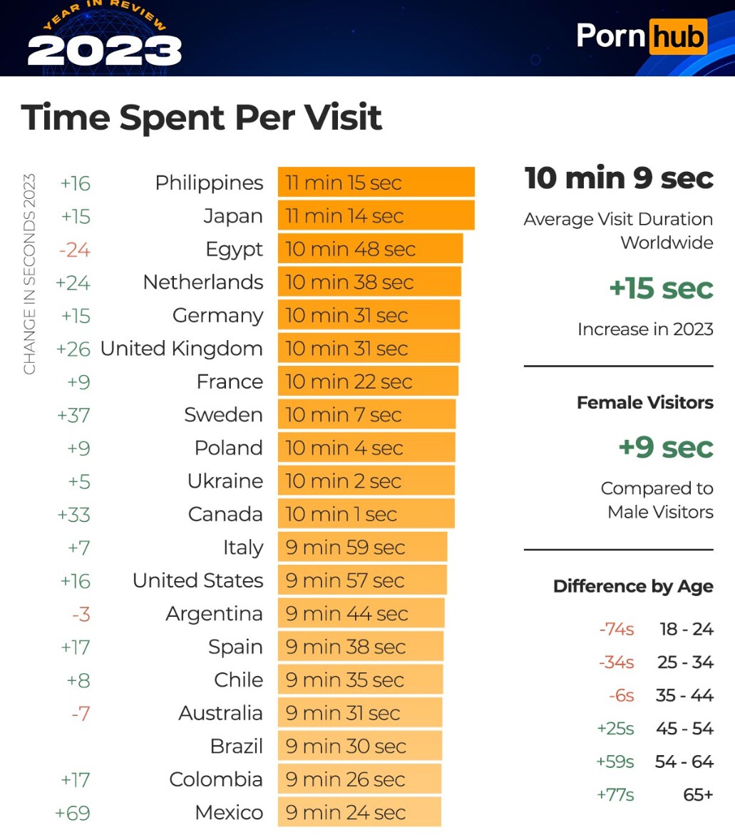 Hay algunos detalles interesantes sobre las estadísticas de consumo. Casi todos los países han aumentado sus tiempos de visita, según Pornhub. México no es la excepción. Las y los mexicanos consumen videos 69 segundos más en cada visita, respecto al año previo. Ese es el aumento de tiempo más significativo en el top 20 de países que más tiempo pasan en Pornhub por visita.