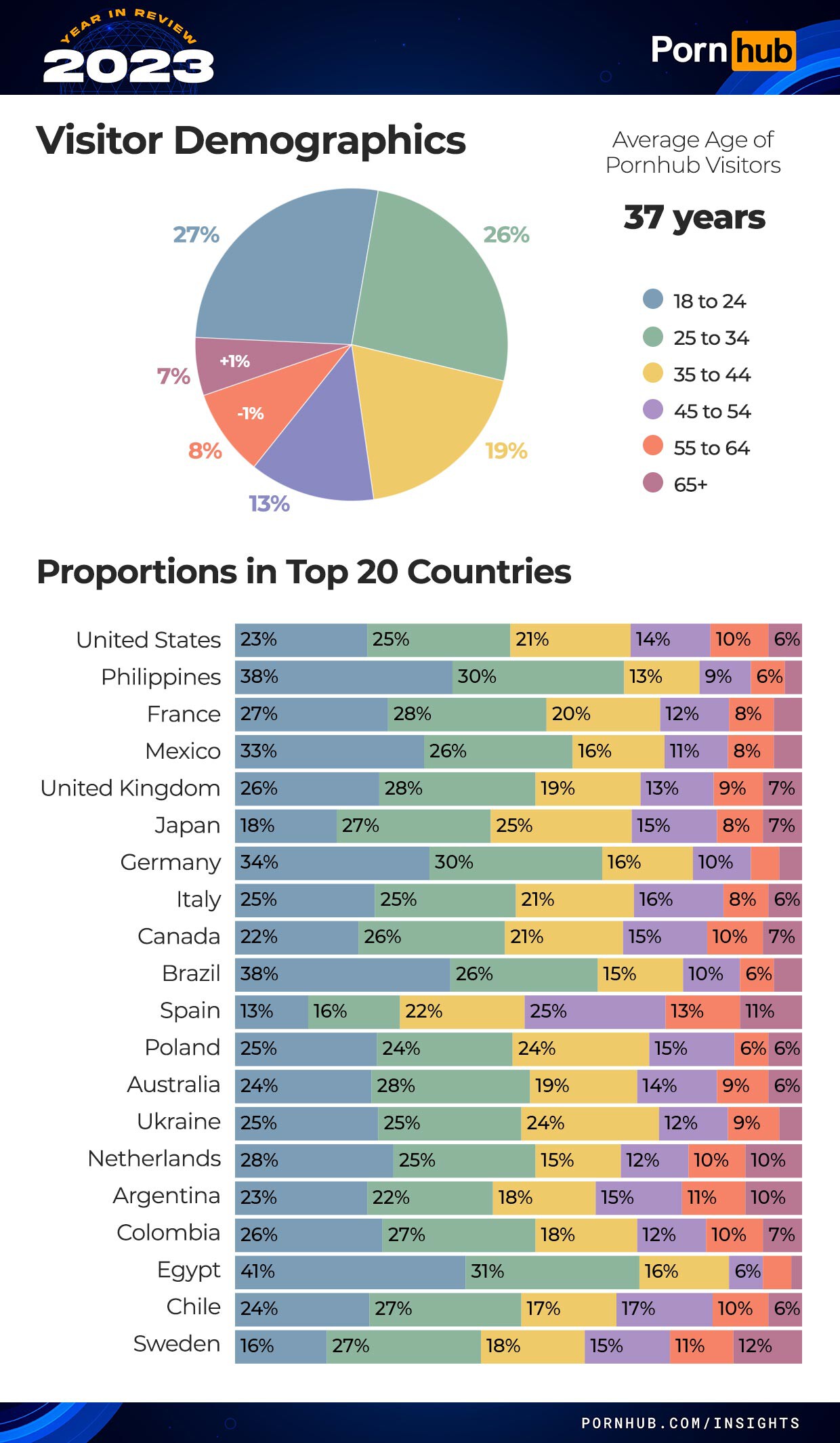 Los consumidores de Pornhub son particularmente jóvenes en México. Para muestra, un dato: la edad promedio de los usuarios de Pornhub a nivel mundial es de 37 años. No obstante, el intervalo de edad de mexicanas y mexicanos que más acceden al sitio es el de personas entre 18 y 24 años. Así, México es el segundo lugar con proporción de más visitantes jóvenes, solo superado por Filipinas.