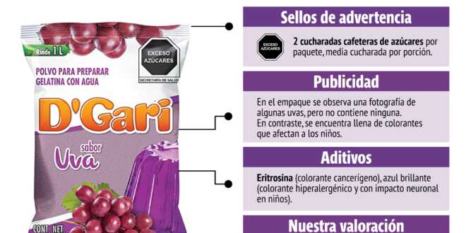 El producto está etiquetado con el sello EXCESO DE AZÚCARES, según lo establecido en la NOM-051 de etiquetado de alimentos y bebidas, por sobrepasar el 10% del total de energía con azúcares añadidos. De hecho, el 70% de la energía total proveniente de azúcares añadidos. El producto D´Gari sabor uva prácticamente es azúcar con colorantes.