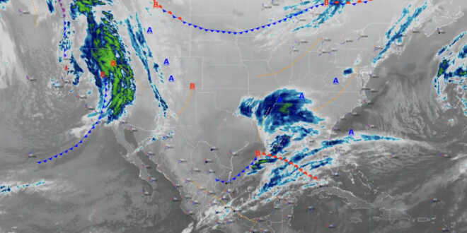 Rachas de viento de 80 a 100 km/h con tolvaneras se pronostican para Chihuahua, Durango y Zacatecas. Este jueves, el frente frío número 24 que se desplazará sobre el noroeste y norte de la República Mexicana, la masa de aire frío que impulsó al frente frío número 22, una vaguada polar y las corrientes en chorro polar y subtropical, ocasionarán un marcado descenso de temperatura en ambas regiones, por lo que se pronostica ambiente gélido con temperaturas mínimas de -15 a -10 grados Celsius y heladas en las sierras de Chihuahua y Durango, y de -10 a -5 grados con heladas en las zonas serranas de Baja California, Sonora y Zacatecas, así como condiciones para la caída de nieve o aguanieve en sierras de Chihuahua y Sonora.