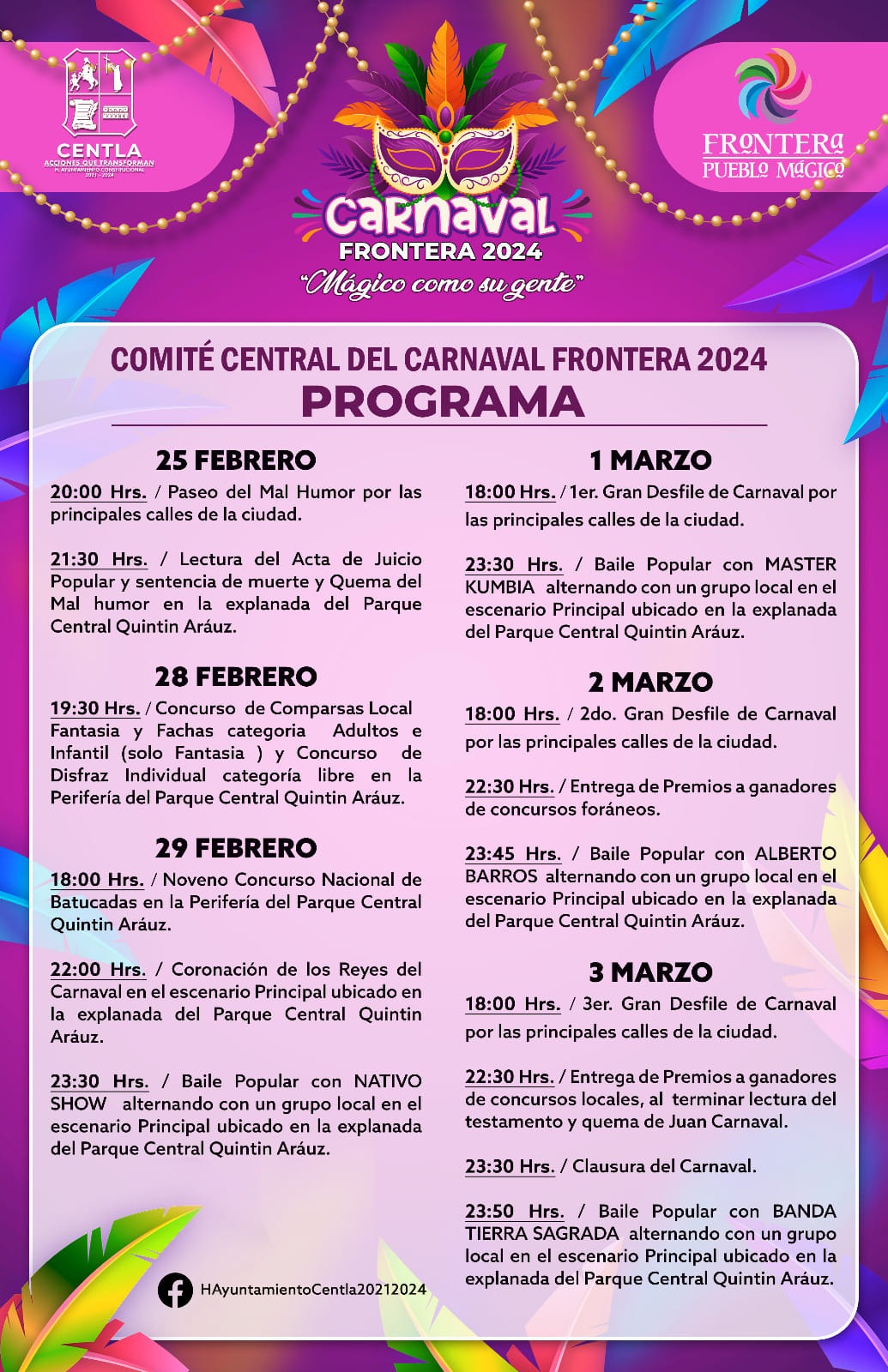 El programa completo de las actividades y la presentación de grupos musicales locales y foráneos puede ser consultado a través de la página oficial de la Secretaría de Turismo de Tabasco y el Ayuntamiento de Centla.