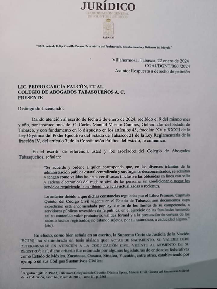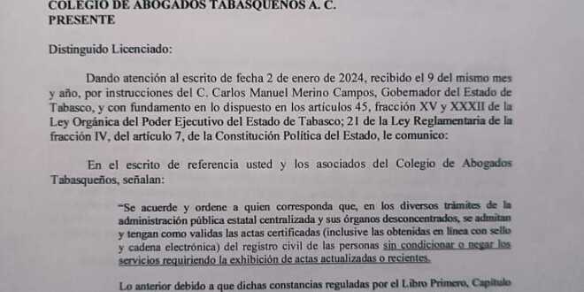 Ningún dispositivo o reglamento legal fija termino o caducidad alguna para la vigencia de las Actas del Registro Civil en el Estado de Tabasco, señaló el Centro de Investigaciones Jurídicas (C-lus) del Colegio de Abogados Tabasqueños.