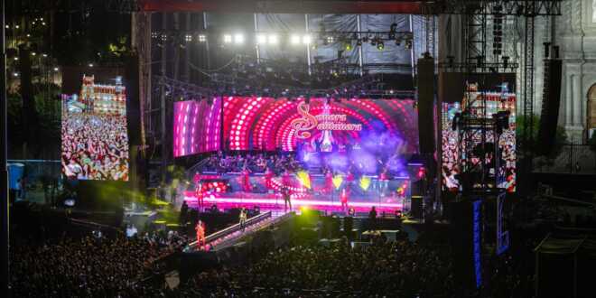 La plancha del Zócalo capitalino se convirtió en una gran pista de baile con canciones como “Ladrón”, “Por las calles de México”, “A ver cómo haces”, “Dios sí perdona, el tiempo no”, “Bésame mucho” y “Corazón de acero”, así como popurrís de grandes artistas como Celia Cruz y Selena, para concluir con broche de oro al ritmo de “A muchos años”.