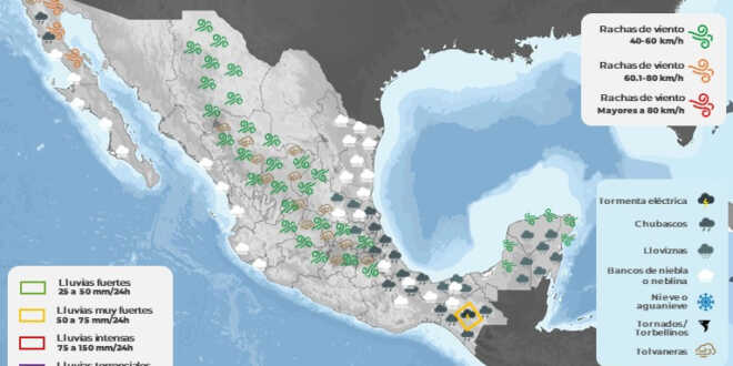 Los sistemas antes mencionados, así como un canal de baja presión extendido en el sureste de la República Mexicana, propiciarán lluvias puntuales fuertes (de 25 a 50 milímetros [mm]) en regiones de Chiapas; intervalos de chubascos (de 5 a 25 mm) en zonas de Baja California, Oaxaca y Veracruz, así como lluvias aisladas (de 0.1 a 5 mm) en Campeche, Hidalgo, Puebla, Quintana Roo, San Luis Potosí, Tabasco y Yucatán