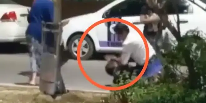 A través de un clip se aprecia cómo un hombre golpea al doctor mientras se encuentra en el suelo, mientras una mujer de la tercera edad lo agrede también con una bolsa de plástico.
