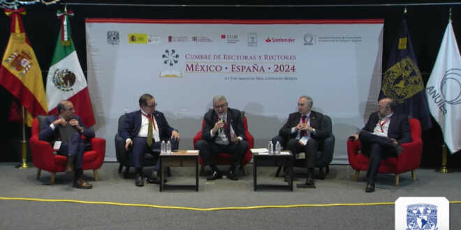 En la ceremonia inaugural de la Cumbre de rectoras y rectores de México y España, el rector de la UNAM, Leonardo Lomelí Vanegas, recordó que tuvieron los intelectuales y científicos españoles que llegaron a México durante el exilio por la Guerra Civil y que enriquecieron cátedras, escuelas y facultades de la Universidad Nacional Autónoma de México. “Las universidades generan modelos novedosos para el desarrollo y el bienestar, impulsan el diálogo y ofrecen el acceso a herramientas y conocimientos”, dijo el rector Lomelí. “Pero las Universidades también enfrentan desafíos sin precedentes que requieren una cooperación internacional para superar problemas apremiantes sociales y ambientales”.