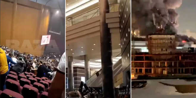 Una explosión y un tiroteo tuvieron lugar este viernes en la sala de conciertos Crocus City Hall, en Krasnogorsk, a las afueras de la capital de Rusia, Moscú, que dejaron varios heridos. Videos compartidos en redes sociales muestran a la gente que estaba disfrutando de un show del grupo Piknik huyendo del salón, así como una densa nube de humo negro saliendo del sitio y se reportó también el colapso del techo del sitio. Inclusive, la agencia TASS dijo que un tercio del edificio está en llamas.