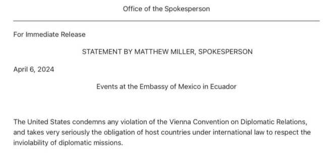 México y Ecuador son socios cruciales de Estados Unidos y valoramos mucho nuestras relaciones con ambos países. Alentamos a los dos países a resolver sus diferencias de acuerdo con las normas internacionales.