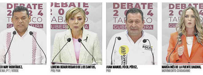 Los candidatos a la gubernatura del estado de Tabasco, Javier May Rodríguez, de Morena; Lorena Beaurregard de los Santos, del PRI-PAN; Juan Manuel Fócil Pérez, del PAN y María Inés de la Fuente Dagdug de MC, confrontaron ayer sus propuestas a favor del estado.
