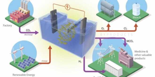 Este tipo de batería almacena la energía renovable generada por paneles solares o turbinas eólicas. Utilizar esta energía cuando el viento y la luz solar no están disponibles requiere una reacción electroquímica que, en la nueva formulación de batería, captura el dióxido de carbono de las emisiones industriales y lo convierte en productos de valor agregado.