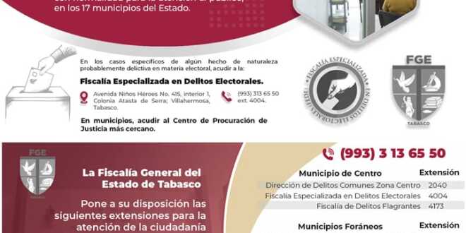 A unas horas de la jornada electoral, la Fiscalía General del Estado (FGE) de Tabasco reitera que se encuentra totalmente preparada para atender cualquier eventualidad en el marco de su ámbito de competencia, para salvaguardar la integridad de los votantes y puedan ejercer su derecho de forma libre y democrática.