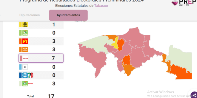 Con el 100% de las actas computadas de la elección para la renovación de las 17 alcaldías del estado, en el Programa de Resultados Preliminares (PREP), del Instituto Electoral y de Participación Ciudadana (IEPC) de Tabasco, Morena se adjudicó la victoria en siete municipios: Huimanguillo, Centro, Cunduacán, Teapa, Macuspana, Centla y Jonuta.