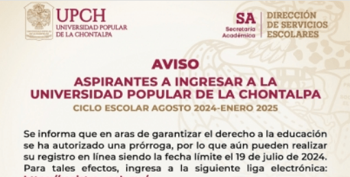 Para garantizar que los egresados del nivel medio superior tengan un espacio en su formación profesional, la Universidad Popular de la Chontalpa abrió un segundo periodo de admisión para quienes deseen cursar alguna de sus carreras como alumnos de nuevo ingreso, dio a conocer su rector Mauro Winzig Negrín.