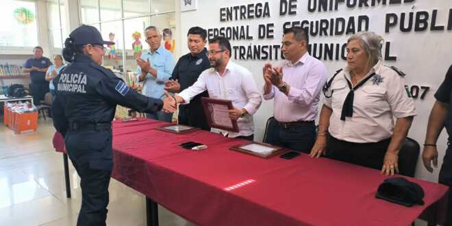 Esta mañana, Eric Garrido Argáez, Presidente Municipal de Jonuta, realizó la entrega de uniformes a elementos de la policía y tránsito municipal, acompañado por el Secretario del Ayuntamiento, Félix Morales Jiménez, el Sargento Emmanuel Correa Morales, Director de Seguridad Pública, Fidelio Quinto Peralta Damián, Asesor de Presidencia, el Teniente Manuel Vicente Acuña Hernández, Subdirector Operativo de Seguridad Pública y en representación del Director de Tránsito Municipal, Marco Antonio Damas Cortéz, Juana Celorio Ávila.