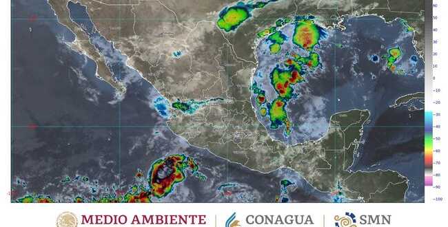 Hoy se pronostican lluvias puntuales intensas (de 75 a 150 milímetros [mm]) en regiones de Chihuahua, Coahuila, Durango, Estado de México, Guanajuato, Hidalgo, Michoacán, Oaxaca, Puebla y Veracruz; muy fuertes (de 50 a 75 mm) en zonas de Chiapas, Ciudad de México, Guerrero, Jalisco, Morelos, Nayarit, Querétaro, Sinaloa, Sonora, Tlaxcala y Zacatecas; fuertes (de 25 a 50 mm) en Aguascalientes, Colima, Nuevo León, San Luis Potosí, Tamaulipas y Tabasco; intervalos de chubascos (5 a 25 mm) en Baja California y Baja California Sur, así como lluvias aisladas (de 0.1 a 5 mm) en Campeche, Quintana Roo y Yucatán. Las lluvias podrán estar acompañadas de descargas eléctricas, rachas fuertes de viento y caída de granizo.