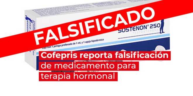 La Comisión Federal para la Protección contra Riesgos Sanitarios (Cofepris) alerta sobre la falsificación de Sostenon 250 (testosterona) 250 mg/mL, en su presentación de caja de cartón que incluye una jeringa de aguja hipodérmica prellenada con 1 mL, medicamento para la atención a pacientes con hipogonadismo y utilizado como terapia hormonal de afirmación de género.