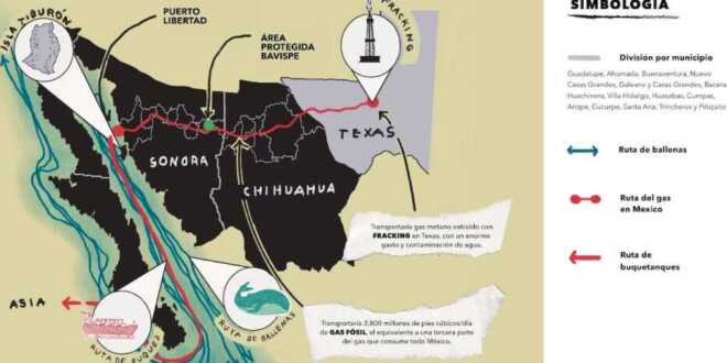 El megaproyecto pretende la exportación de gas fósil desde Puerto Libertad, una pequeña comunidad de pescadores. El gas que llegaría es extraído con la contaminante técnica de fracking, en Texas, la cual utiliza millones de litros de agua en un solo pozo y contamina el subsuelo, el aire y la tierra en la que se inyecta agua a presión con químicos cancerígenos para fracturar las rocas en las que se encuentra atrapado el gas, advierten las ongs. “Para llevar el gas a la costa de Sonora, se plantea la construcción de infraestructura de 800 km de largo en nuestro país, atravesando sierras, comunidades, ríos, arroyos y zonas de importancia ecosistémica”.
