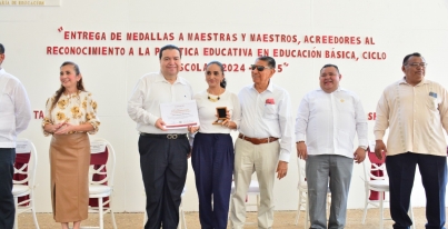 En la ceremonia en la que se entregaron medallas a maestras y maestros acreedores al reconocimiento a la práctica educativa en educación básica, ciclo 2024-2025, aseveró que hoy se puede afirmar con orgullo y responsabilidad, que los maestros de educación básica de Tabasco, cumplen con creces los objetivos del Programa Sectorial de Educación 2020-2024.