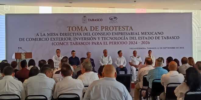 Al tomar protesta a la nueva mesa directiva del Consejo Empresarial Mexicano de Comercio Exterior, Inversión y Tecnología del Estado (COMCE), el gobernador Carlos Manuel Merino Campos afirmó que la nueva administración recibirá un Tabasco con bases para presentarse al mundo como una entidad confiable, sostenible y preparada para recibir las inversiones que detonen el desarrollo económico que todos anhelamos