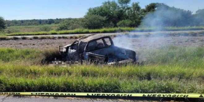Peritos de la Unidad de Servicios Periciales se encargaron de procesar la escena, asegurando un vehículo ‘pick-up’ completamente incendiado, junto a diversos cargadores, casquillos de diferentes calibres y dos armas largas.