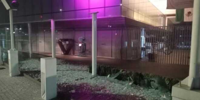 Policías auxiliares encargados de la custodia informaron que en la madrugada de este miércoles, escucharon pasos de varias personas que arrojaron objetos contra los cristales del acceso y lograron estrellarlos.