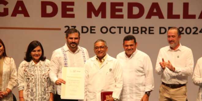 En ese marco, también entregó la Medalla al Mérito Médico a tres distinguidos profesionistas, por su contribución en favor de la salud de los tabasqueños, su dedicación y esfuerzo.