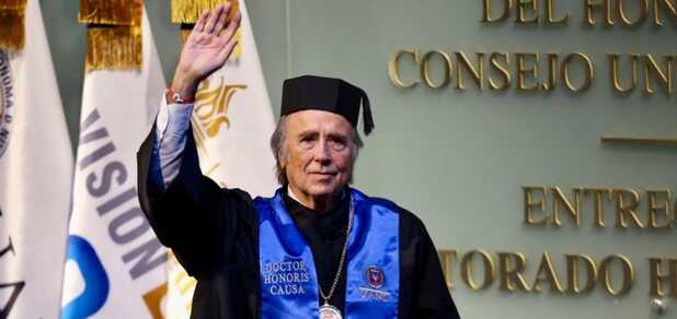 El cantante español Joan Manuel Serrat recibió este miércoles la distinción del doctorado honoris causa por parte de la Universidad Autónoma de Nuevo León (UANL), por su contribución a la literatura española y la música.