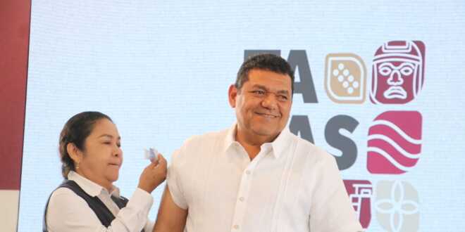 Durante la presentación del avance de resultados en materia de vacunación, el gobernador del estado, Javier May Rodríguez, recibió una dosis contra la influenza; el biológico se encuentran disponible en las 664 unidades de salud con que cuenta la entidad.