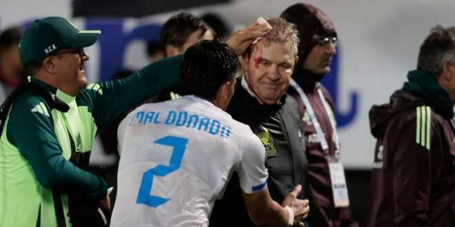 A pesar del fuerte golpe que recibe en la cabeza, Javier Aguirre sigue platicando con el cuerpo técnico de Honduras. Segundos después le brota sangre mientras que los directivos de la selección «catracha» le piden a sus «aficionados» que dejen de arrojar objetos a la cancha del Estadio General Francisco Morazán.