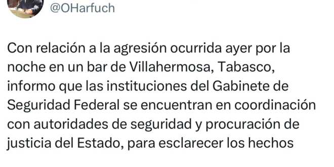 En relación con la agresión ocurrida la noche del sábado 04 de enero en un bar de Villahermosa, Tabasco, donde cinco personas perdieron la vida y siete resultaron lesionadas, la Secretaría de Seguridad y Protección Ciudadana (SSPC) informa que las instituciones del Gabinete de Seguridad colaboran con las autoridades locales para el esclarecimiento de los hechos.