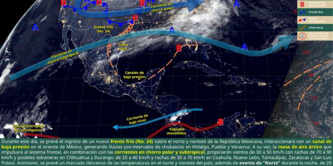 Hoy, se espera viento de 30 a 50 kilómetros por hora (km/h) con rachas de 70 a 90 km/h y posibles tolvaneras en Chihuahua y Durango; así como rachas de 50 a 70 km/h en Coahuila, Nuevo León, Tamaulipas, Zacatecas y San Luis Potosí; de 40 a 60 km/h en la costa de Baja California, Baja California Sur, golfo de California, Sonora, la costa de Sinaloa, Aguascalientes, el norte de Jalisco, el norte de Guanajuato, el sur de Tabasco, Campeche, Yucatán y la costa de Quintana Roo.