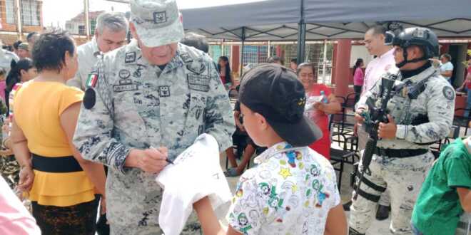 El capitán Juan Carlos López Reyes, fue el encargado del campamento ubicado en la Casa Hábitat, donde elementos del 19 Batallón de la Coordinación Estatal realizaron labores y servicios gratuitos a las familias, como parte de las acciones que el Gobierno y autoridades federales realizan para fortalecer la confianza ciudadana y prevenir el delito.