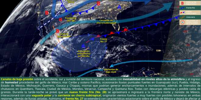 Este martes, canales de baja presión sobre el occidente, sur y sureste del territorio nacional, inestabilidad en niveles altos de la atmósfera y el ingreso de humedad de ambos litorales, originarán lluvias fuertes (de 25 a 50 milímetros [mm]) en Puebla, Hidalgo, Estado de México, Michoacán, Guerrero, Oaxaca, Chiapas y el sur de Guanajuato; chubascos (de 5 a 25 mm) en Querétaro, Tlaxcala, Ciudad de México, Morelos, Veracruz, Campeche y Quintana Roo, y lluvias aisladas (de 0.1 a 5 mm) en Coahuila, Nuevo León, Tamaulipas, San Luis Potosí, Jalisco, Tabasco y Yucatán.