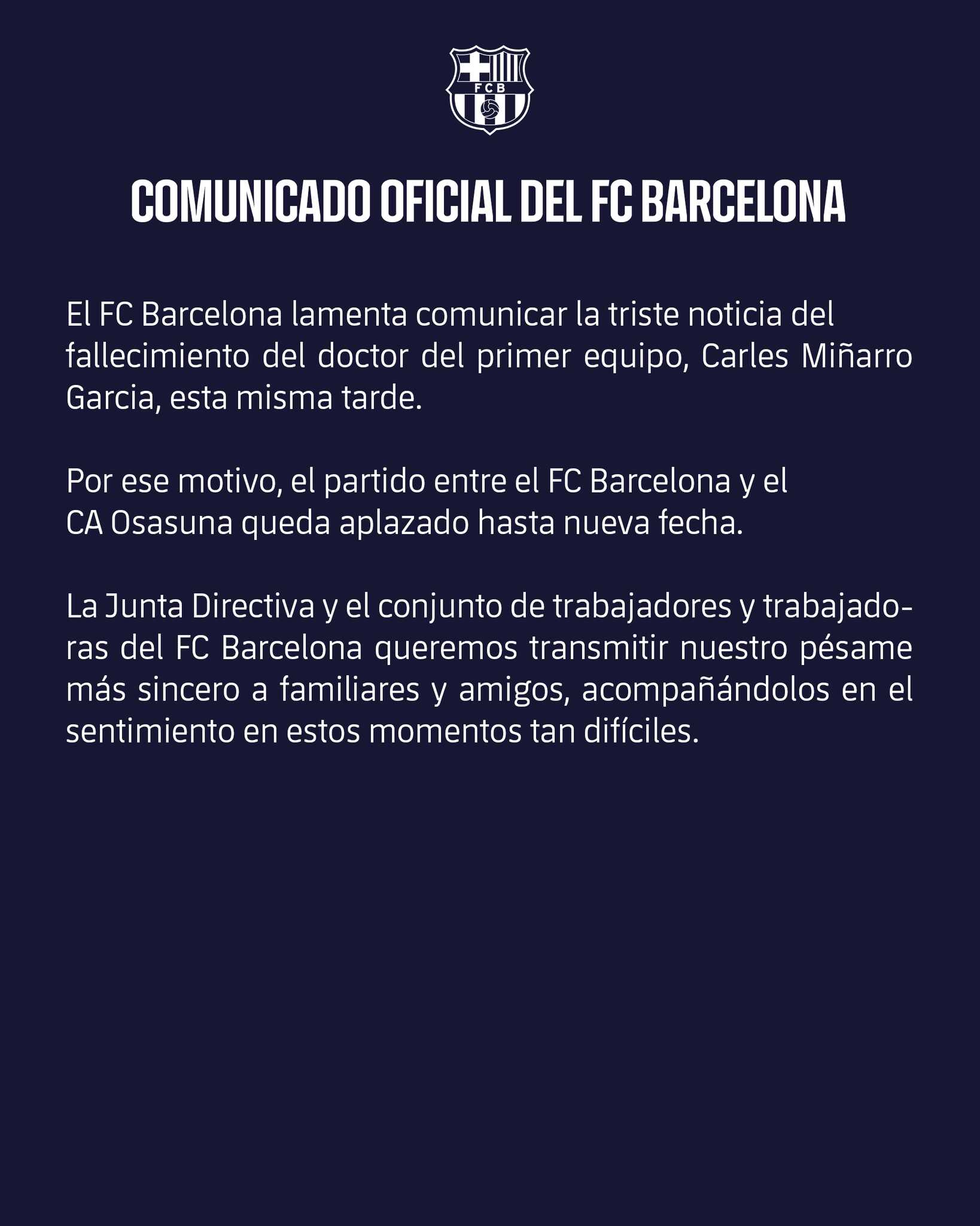 El partido entre Barcelona y Osasuna, correspondiente a la jornada 27 de LaLiga, fue suspendido este sábado minutos antes de su inicio debido al fallecimiento de Carles Miñarro, miembro del cuerpo médico del Barcelona. El club anunció la noticia a tan solo 18 minutos del comienzo del encuentro, lo que llevó al presidente Joan Laporta, en acuerdo con la plantilla y con el equipo rival, a tomar la decisión de suspender el partido.