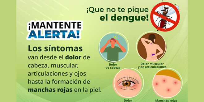 Síntomas: Fiebre alta, dolor de cabeza, muscular y óseo, náuseas, vómitos, cansancio extremo, sarpullido, sangrados.
